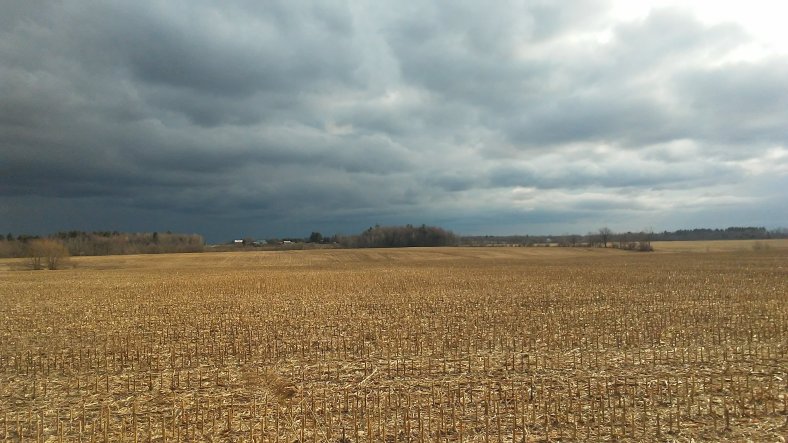 Storms clouds to the south and east of Highway 10 near St. Eugene, Ontario, over a massive cornfield. These storms missed me!