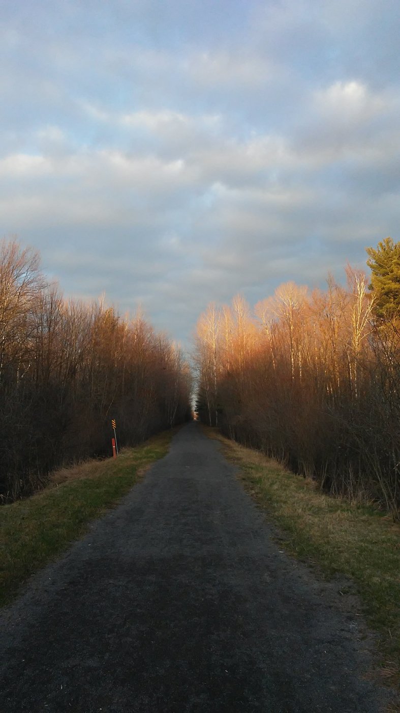 Nearing the end of the Prescott-Russell Rail Trail at dusk.