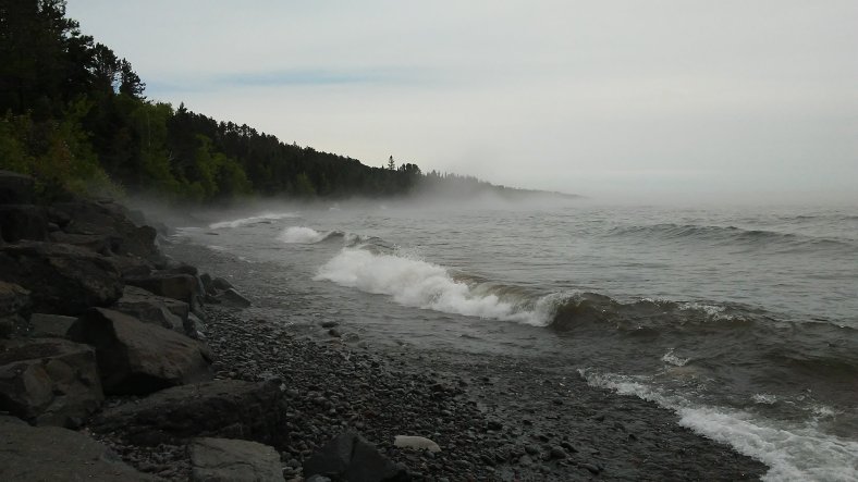 Amazingly, the rain spared me for the rest of the day. Dark clouds were visible to my south and east throughout the day. The day before, the lakeshore was peaceful under sunny skies. Small waves lapped at the shoreline. Today, the lake was angry. Three foot waves violently crashed onto the rocky coast. I hadn’t seen this side of Lake Superior yet!