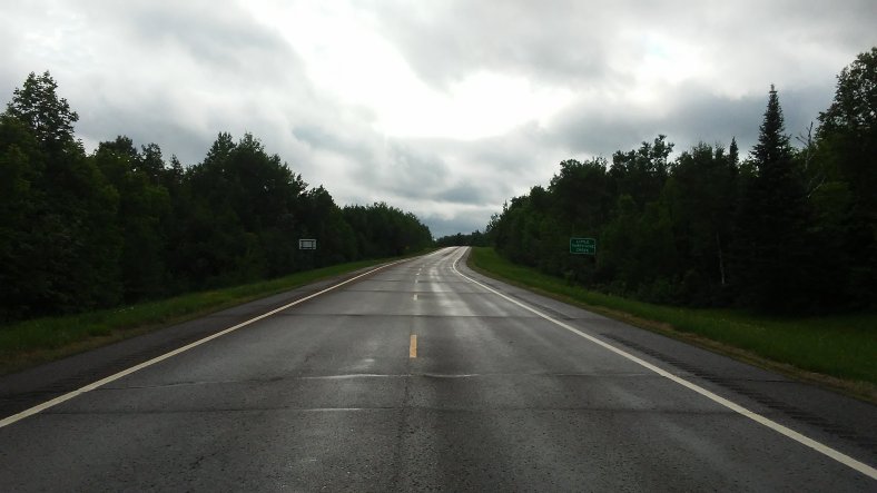 I left Silver Bay knowing that I was going to be in for a wet afternoon. After I left the grocery store, I made it about four miles before thunderstorms sidelined me for two hours. I don’t mind walking in some rain, but I draw the line at walking through thunder and lightning. I found a low spot off the road and sat under my umbrella, waiting for the lightning to stop. As I contemplated whether I would get any more walking in, the storms steadily dissipated and I cautiously resumed my stroll. The clouds slowly lifted and I managed another 12 miles. Patience had paid off.