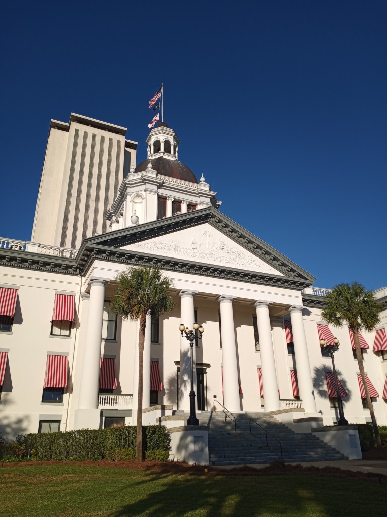 Yesterday I took in Florida’s capital city on the walk west through town. I stopped by the capitol building and meandered through FSU’s campus before reaching Highway 20 and walking to my current location.