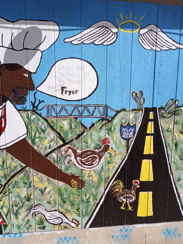Why did the chicken cross the road? To get away from the fryer! This mural was painted on the wall of a fried chicken joint in Carlsbad.