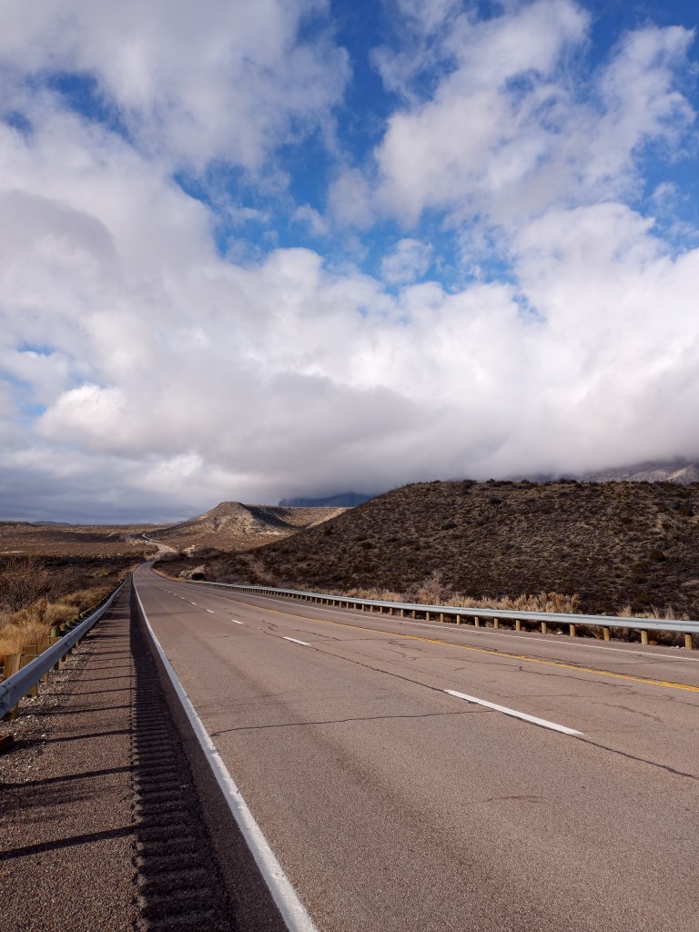 I woke up the following morning to chilly temperatures (a low of 26!) but sunny skies. The wind died down overnight and the forecast called for calmer conditions for the next three days! After packing up camp and returning to the road shoulder, I caught a glimpse of the magnificent Guadalupe Mountains, free of any clouds!