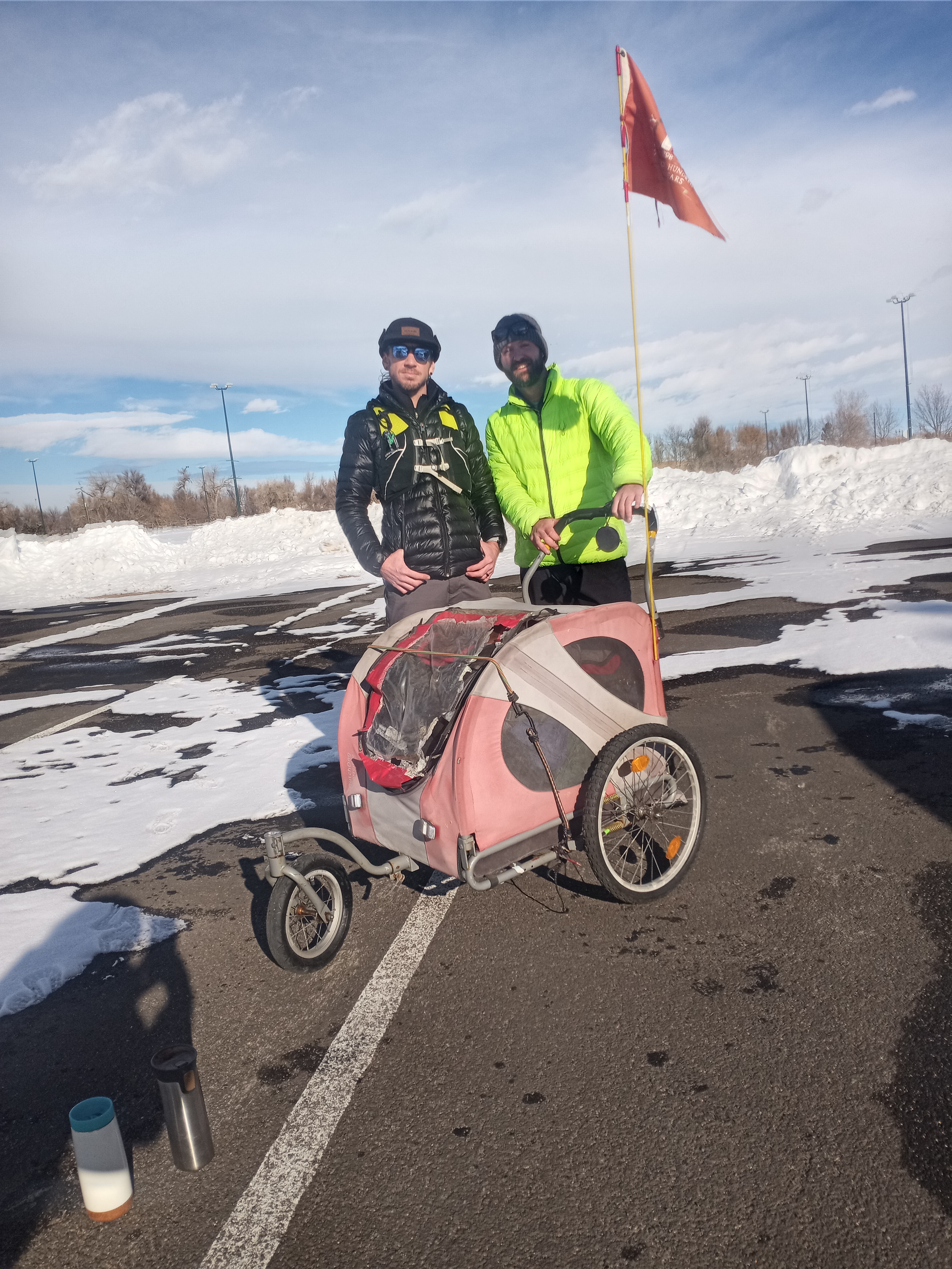 Thankfully, we enjoyed well-plowed trails and road shoulders for the first 25 miles of our walk – until we reached the sidewalk that crossed Interstate 25. There was a 100 yard stretch (uphill, of course) that wasn’t cleared. Six inches of snow and ice covered the sidewalk. PJ was impossible to push through the wintry mess. The only option was to carry the overloaded cart up the lengthy hill. Shea picked PJ up by his front wheel, while I got down into a squat position and lifted the back. We awkwardly made our way up the hill, taking a quick break at the halfway point. By the time we reached a traffic light and saw a clear path ahead, we were out of breath. We both agreed we brought way too much shit.