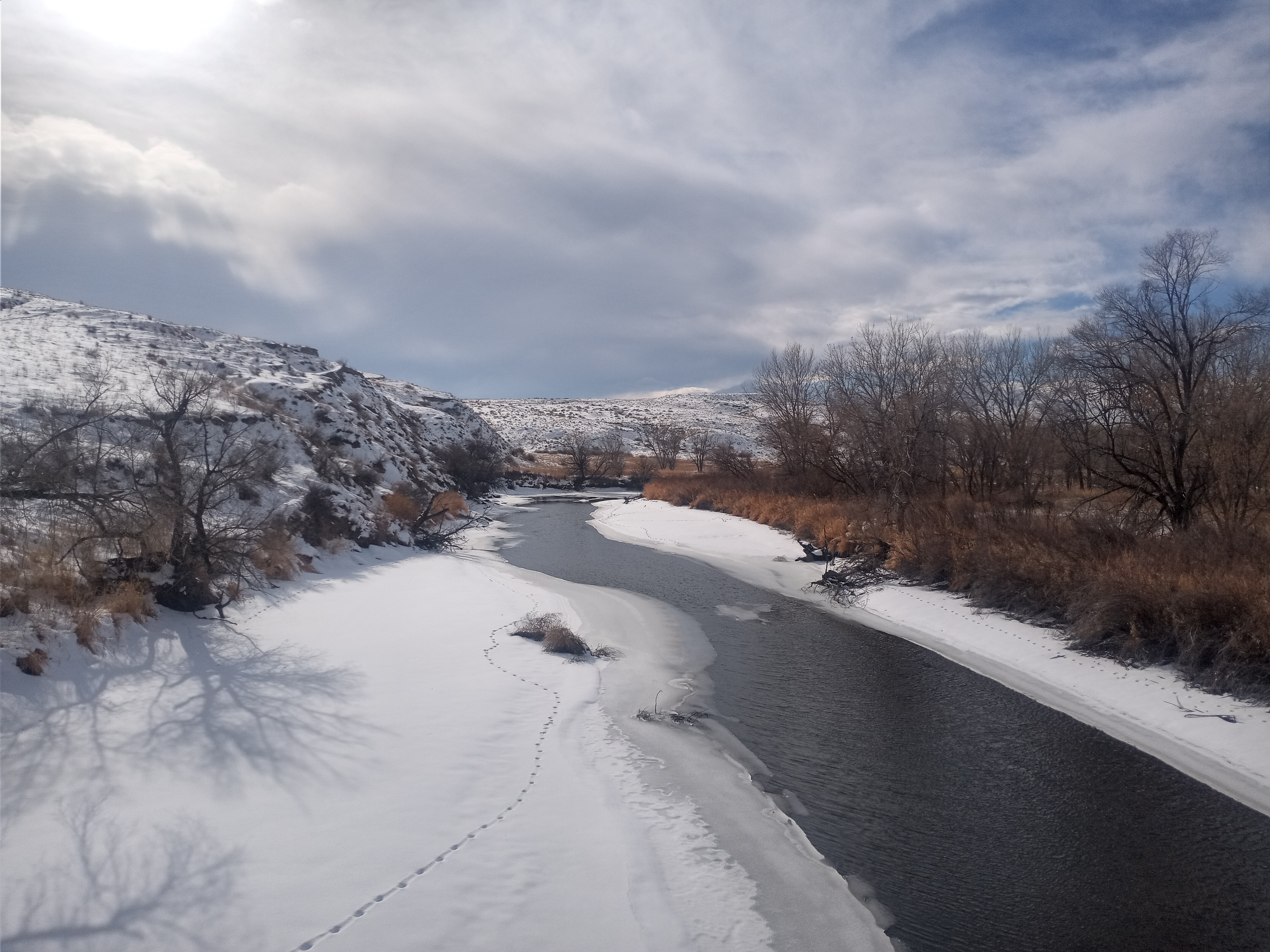We spent most of our time in Fort Collins walking the Spring Creek Trail. The trail meanders along the banks of Spring Creek through the middle of the city and eventually ends near CSU’s campus. Even though the moon was only half full, we didn’t need to use any lights walking on the paths in Fort Collins. Eight inches of snow, lit up by the moonlight, added a surprising amount of light and guided us through the quiet urban forests along the trail.