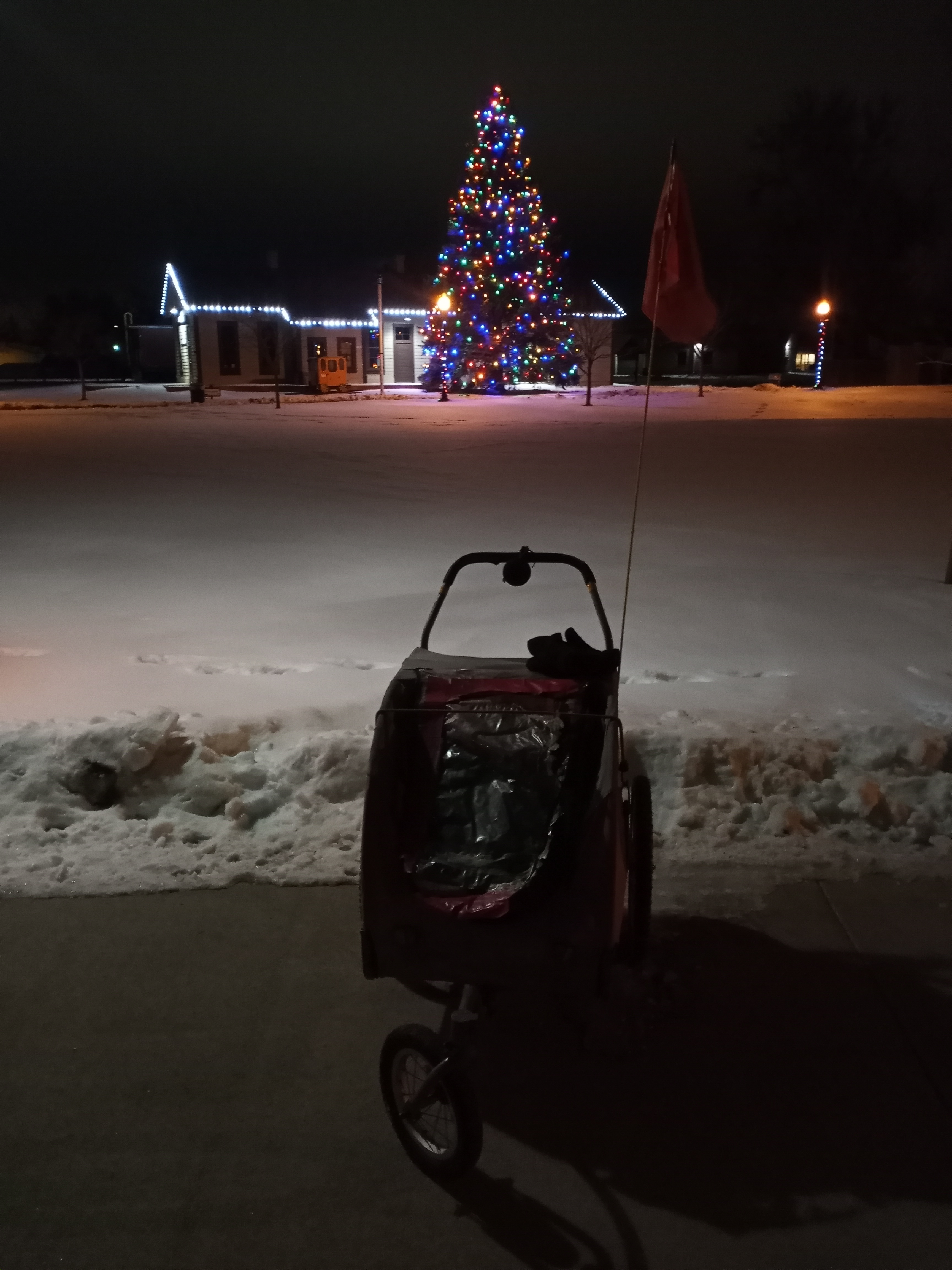 We took a brief detour to visit the new football stadium on campus and snapped a couple photos next to the dueling rams statue in front of the field. From there, we walked back to Spring Creek Trail and continued west for another four miles before turning around and starting our walk back to Windsor. We approached the 38 mile mark when, all of a sudden, PJ became incredibly difficult to push. Initially, I thought he was being a petulant child and didn’t want to keep walking in the frigid air. Upon further review, we realized his left tire was completely flat.