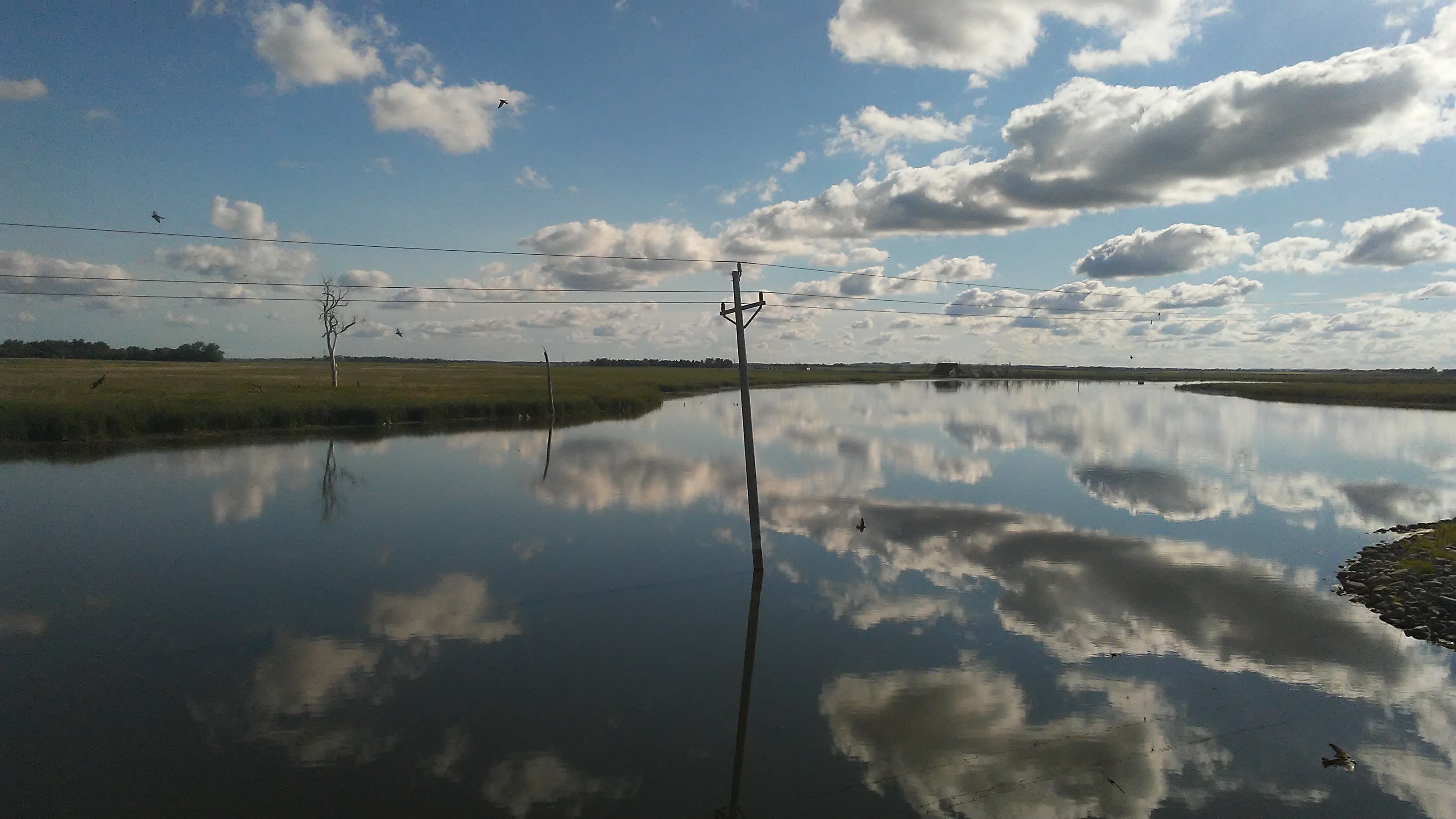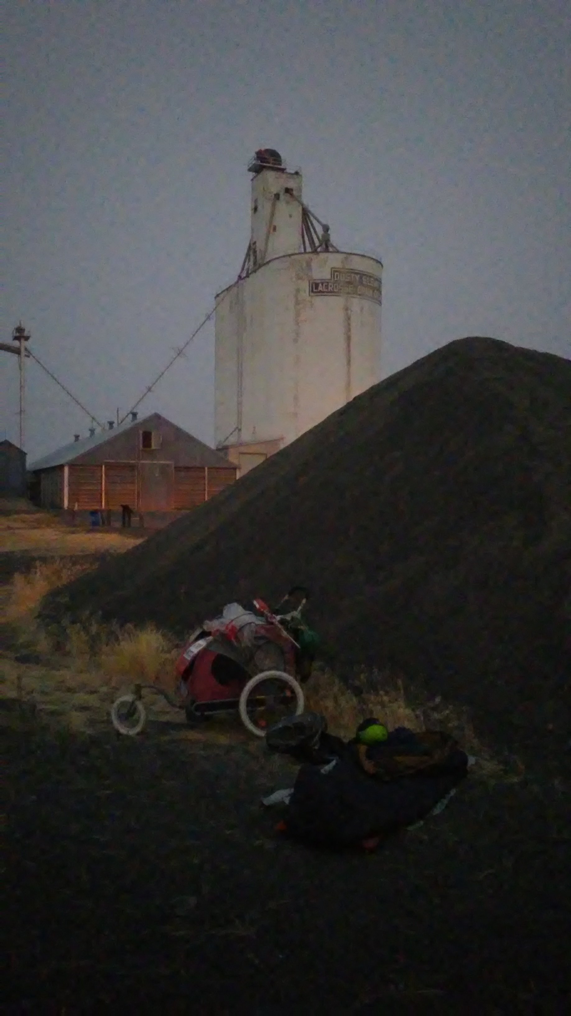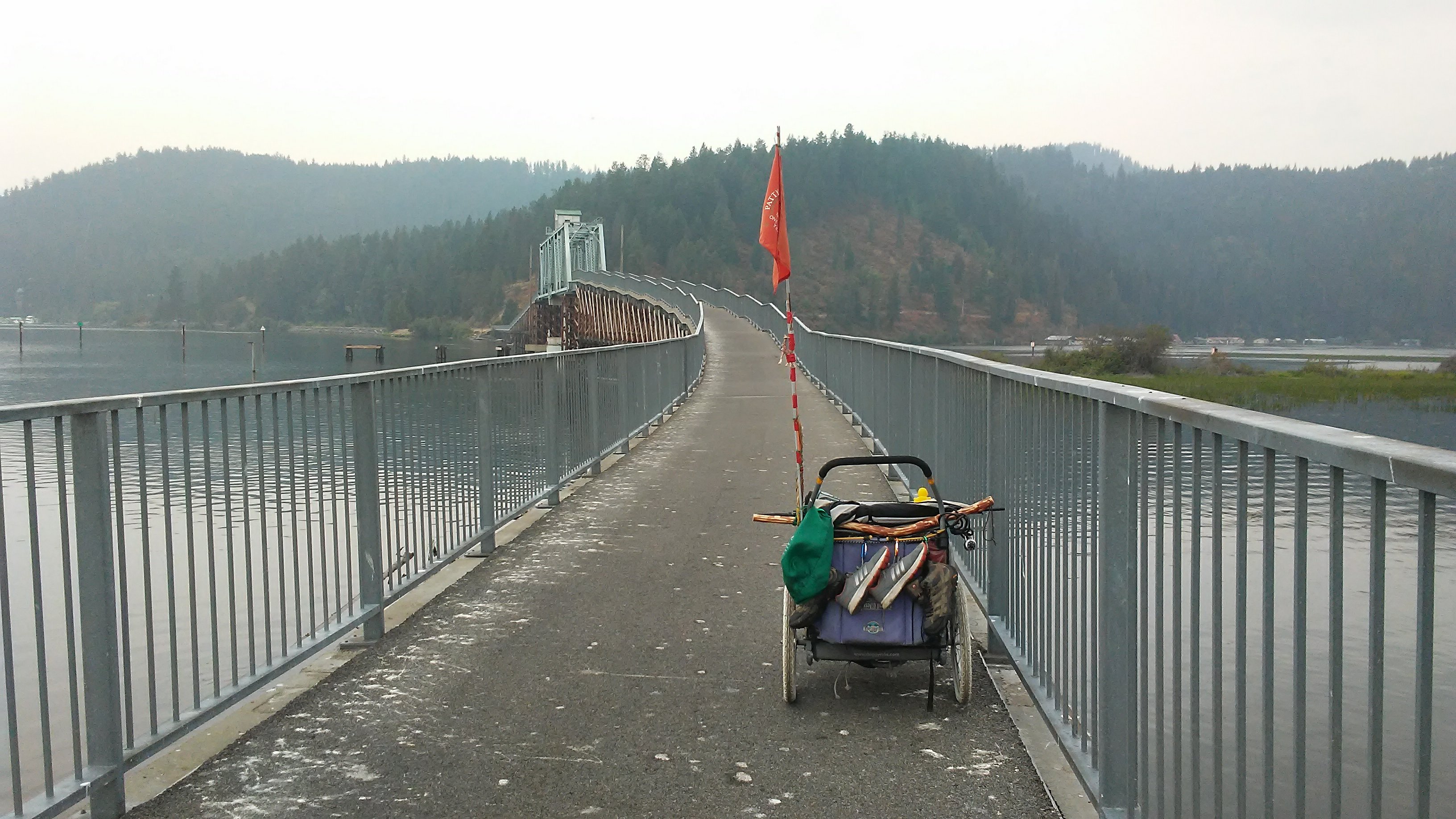I arrived at the first bridge at dusk, waited for a gap in traffic, and ran. PJ’s front tire started wiggling uncontrollably halfway across. “Not now PJ!” I yelled. I had to slow down to get the tire rolling true again. I sped walked the rest of the way. A semi approached 10 feet from the edge of the bridge. He moved to my right a few feet while we cleared the end of the bridge onto the safety of the shoulder. “What a rush!” I hollered. “Whoooooooooo!”