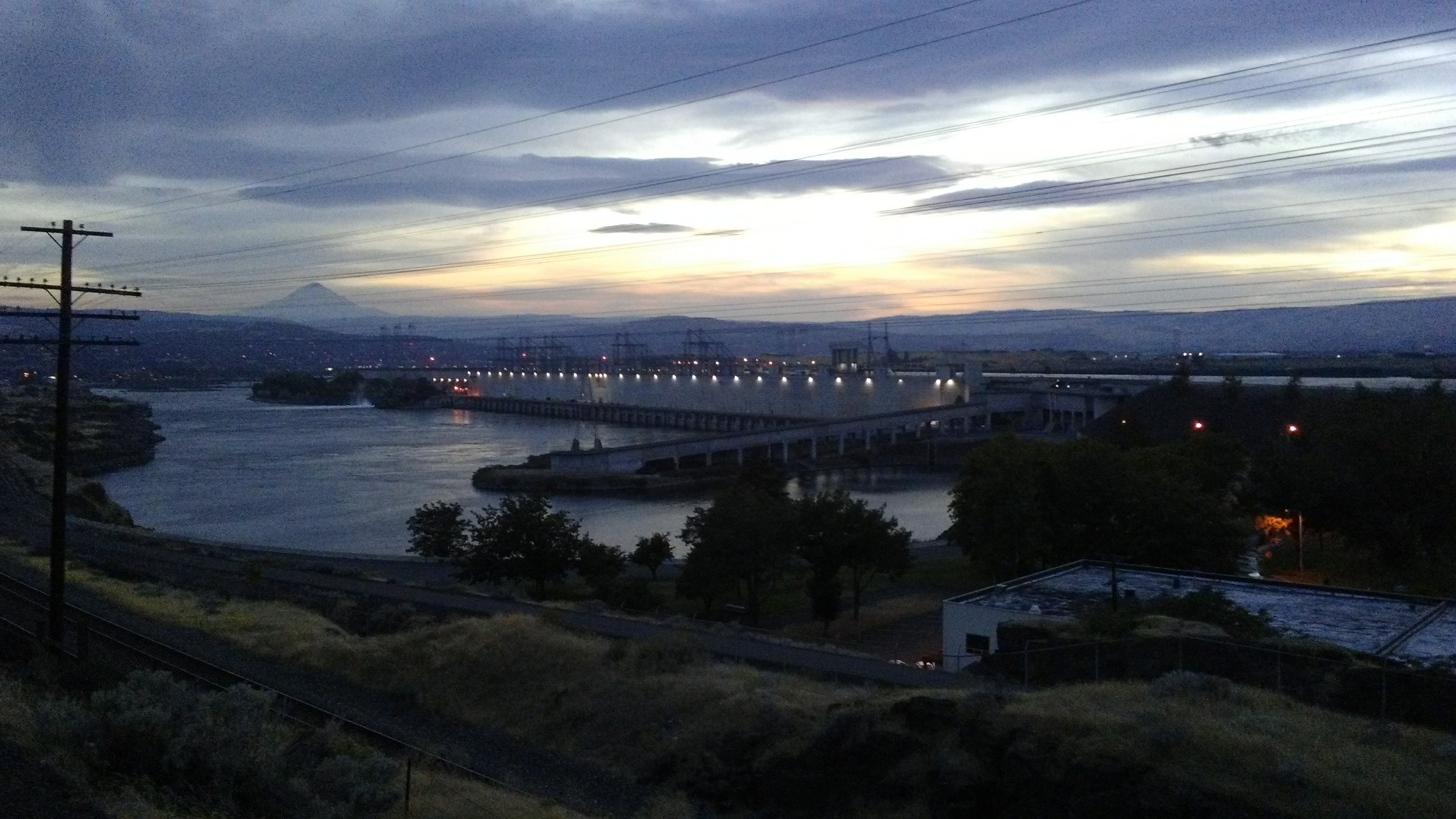 My 36 mile walk to The Dalles was straight forward. I just had to put one foot in front of the other 76,000 times. I officially entered the Columbia River Gorge Scenic Area a bit west of Rufus and approached The Dalles at dusk. Impressive Mount Hood was visible to the southwest and the massive Dalles Dam was lit up like a Christmas tree as I made my way into town.