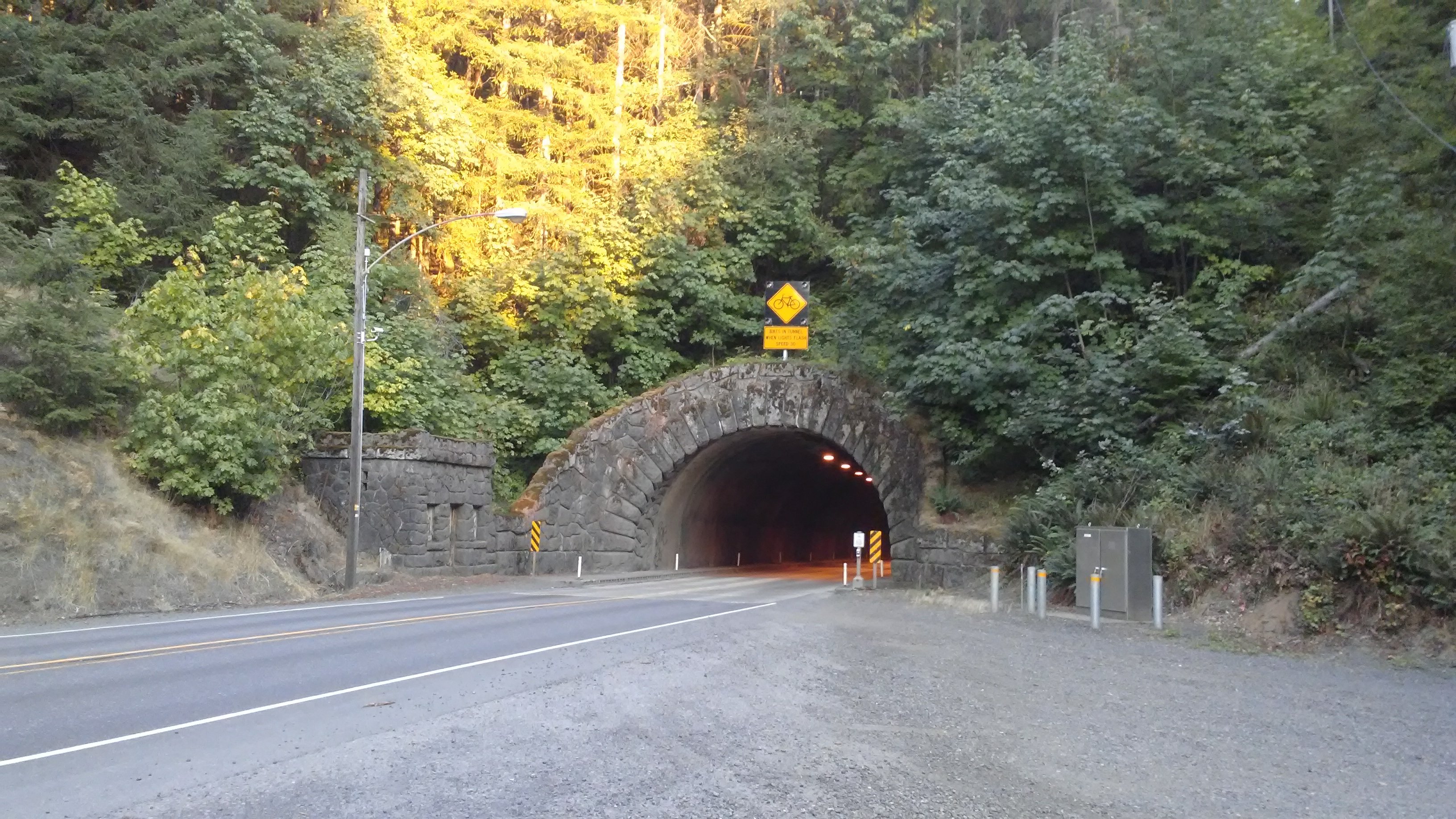 In addition to some shoulderless stretches, Highway 26 also had a tunnel and a long bridge that were a bit dangerous. Fortunately there was a button to push before entering the tunnel (and crossing the bridge), causing a light to flash to warn drivers of a walker/biker in the tunnel.